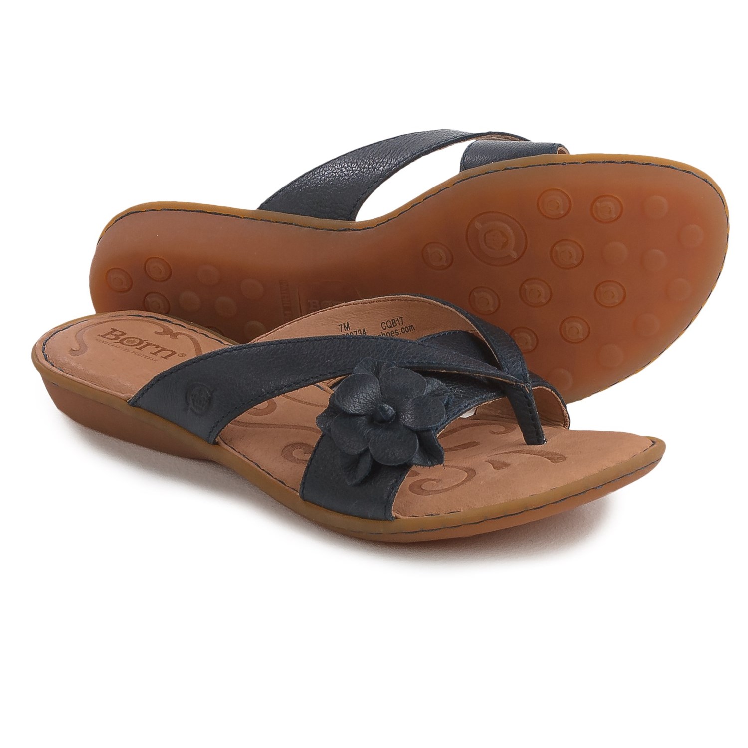 Closeouts. You’ll love the simplicity and girly touches in Born’s Olga sandals, outfitted with a pretty, modified flip-flop-inspired upper and accented with an intricate leather flower at the side. The footbed is soft, flexible leather with ample cushion underneath.