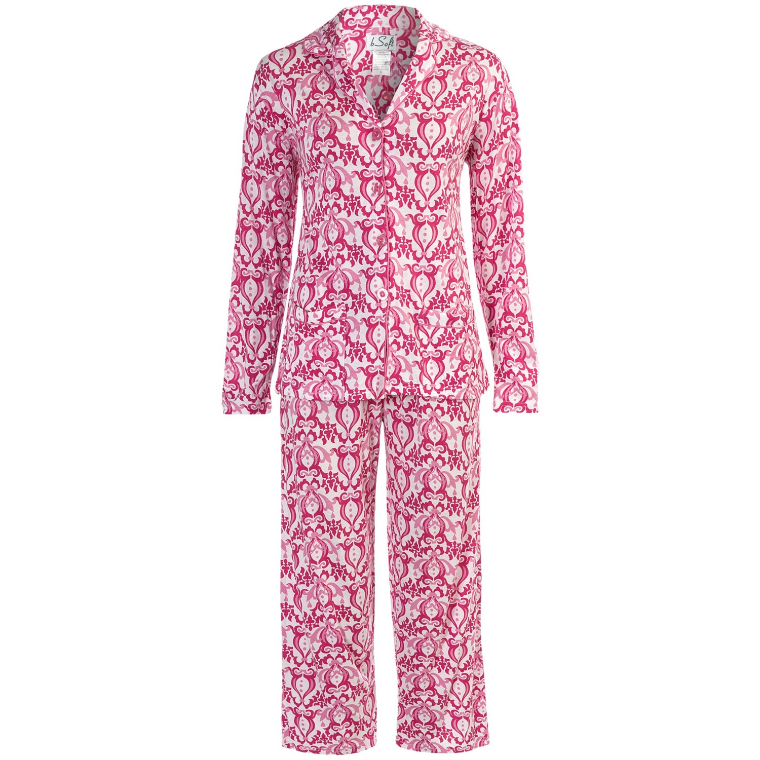 Closeouts. Silky soft and feminine, these sweet pajamas from bSoft by Frankie and Johnny are made of a delicate rayon-cotton blend with a comfy button-front top and cozy, straight-leg ankle pants.