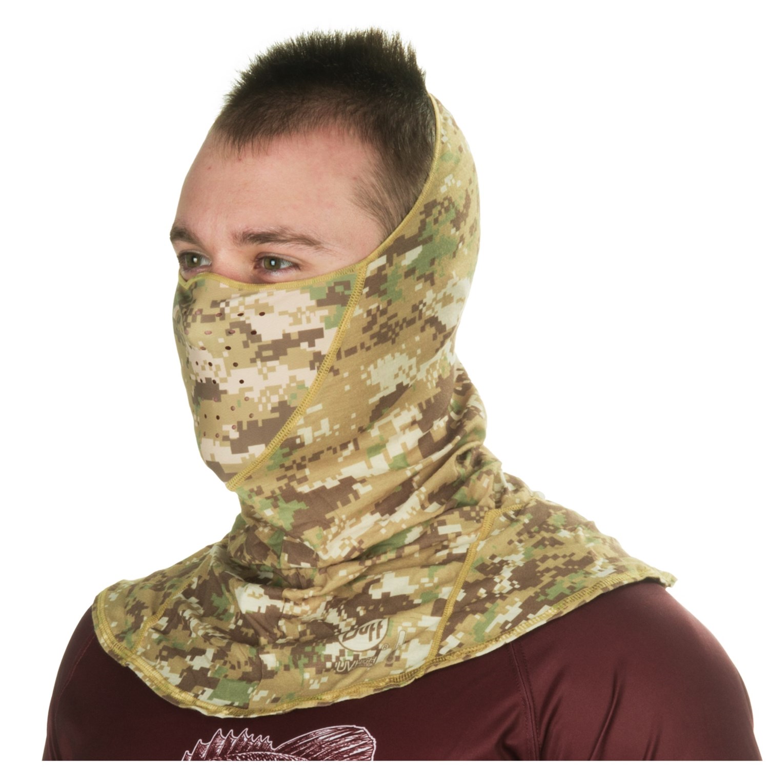 Closeouts. As a neck gaiter or as a face covering, the Buff UVX mask gives you multiple options to keep the sun off your skin. Its stretchy performance fabric wicks moisture and dries quickly to keep you cool, too, and laser-cut breathing slits give you room to breathe without fogging your shades.