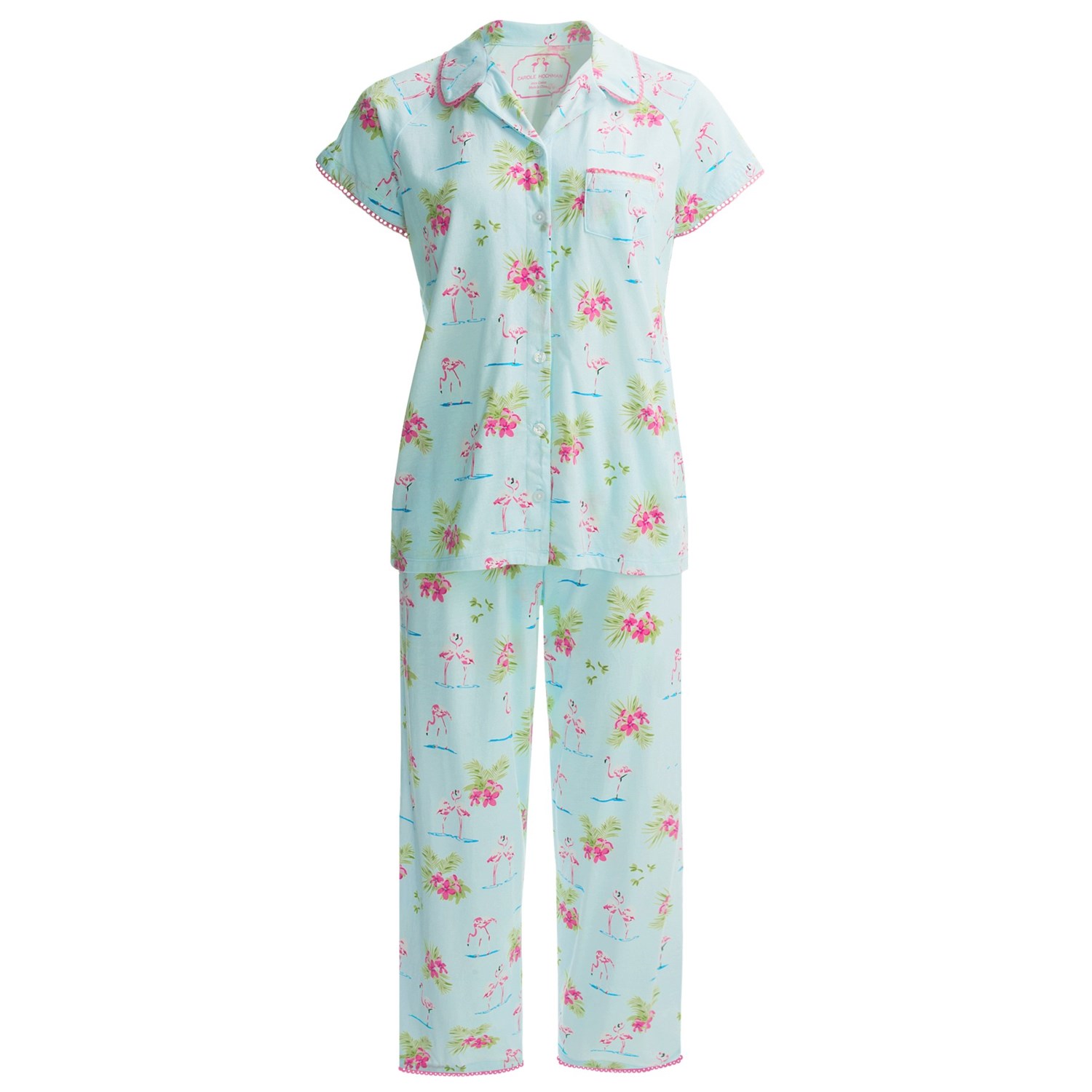 Closeouts. Exotic florals and birds adorn the supersoft, lightweight jersey cotton of Carole Hochman’s Birds of Paradise pajamas, featuring a comfy button-down top and non-restrictive capris.