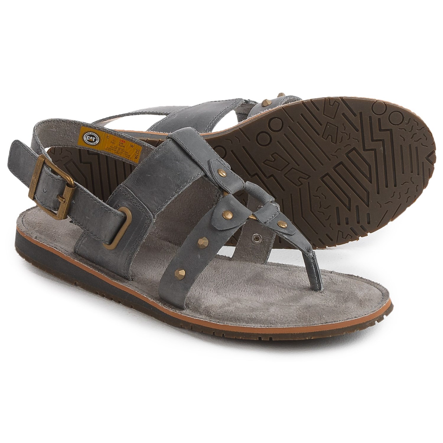 Closeouts. A strappy leather upper and a cushioned footbed make Caterpillar’s Birdsong sandals luxury summer footwear. Antique brass hardware and stud detailing provide an edgy, fashionable touch.