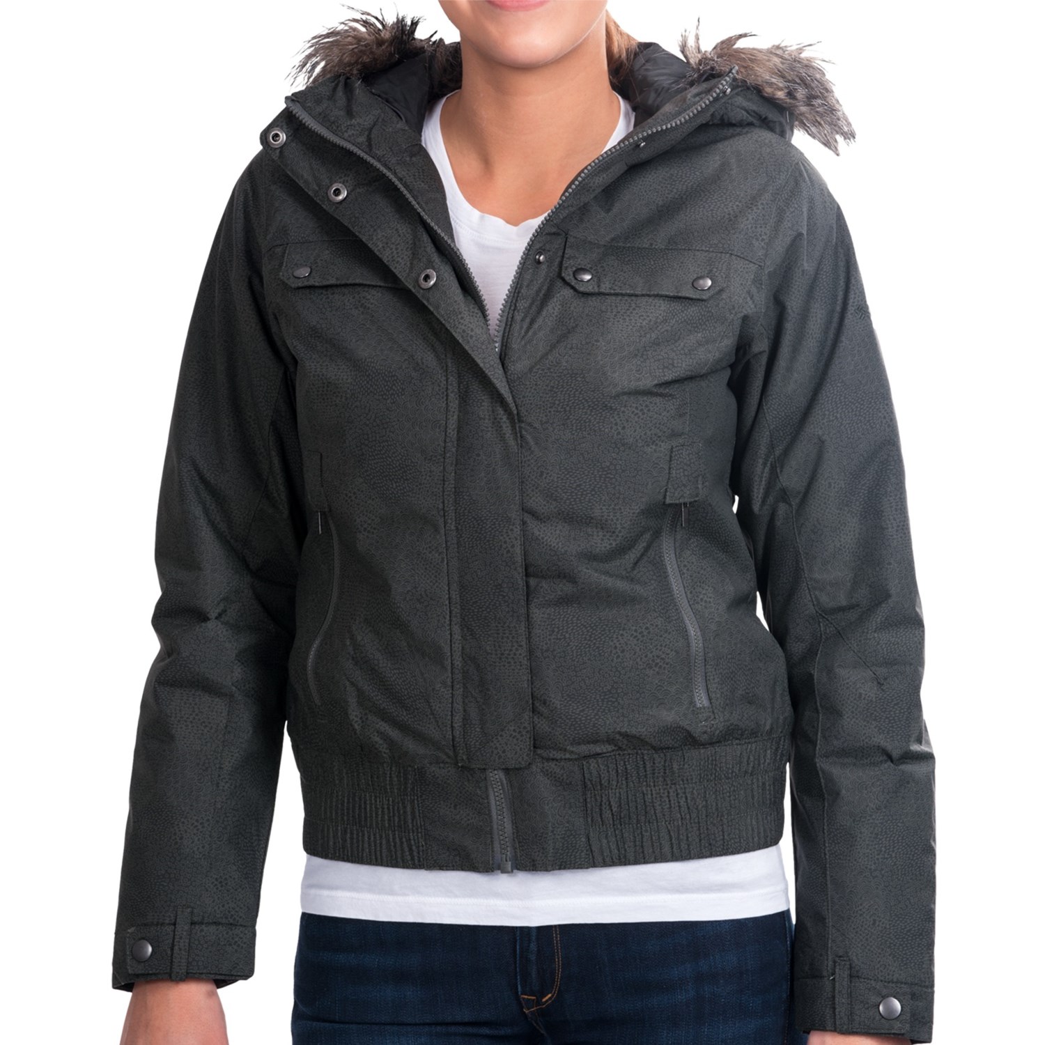 Closeouts. A sweet bomber style with plenty of street appeal, Columbia Sportswear’s Peak Drifter II jacket offers warmth and water resistance in a pretty, subdued print that amps up the feminine appeal with faux-fur trim on the hood (easily snaps off when you want to lose the glam).