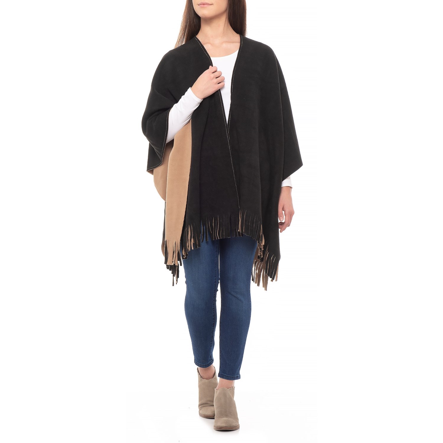 Closeouts. The drapey, plush Dakini solid reversible fleece ruana offers a light dose of toasty warmth thanks to the cozy fleece fabric.
