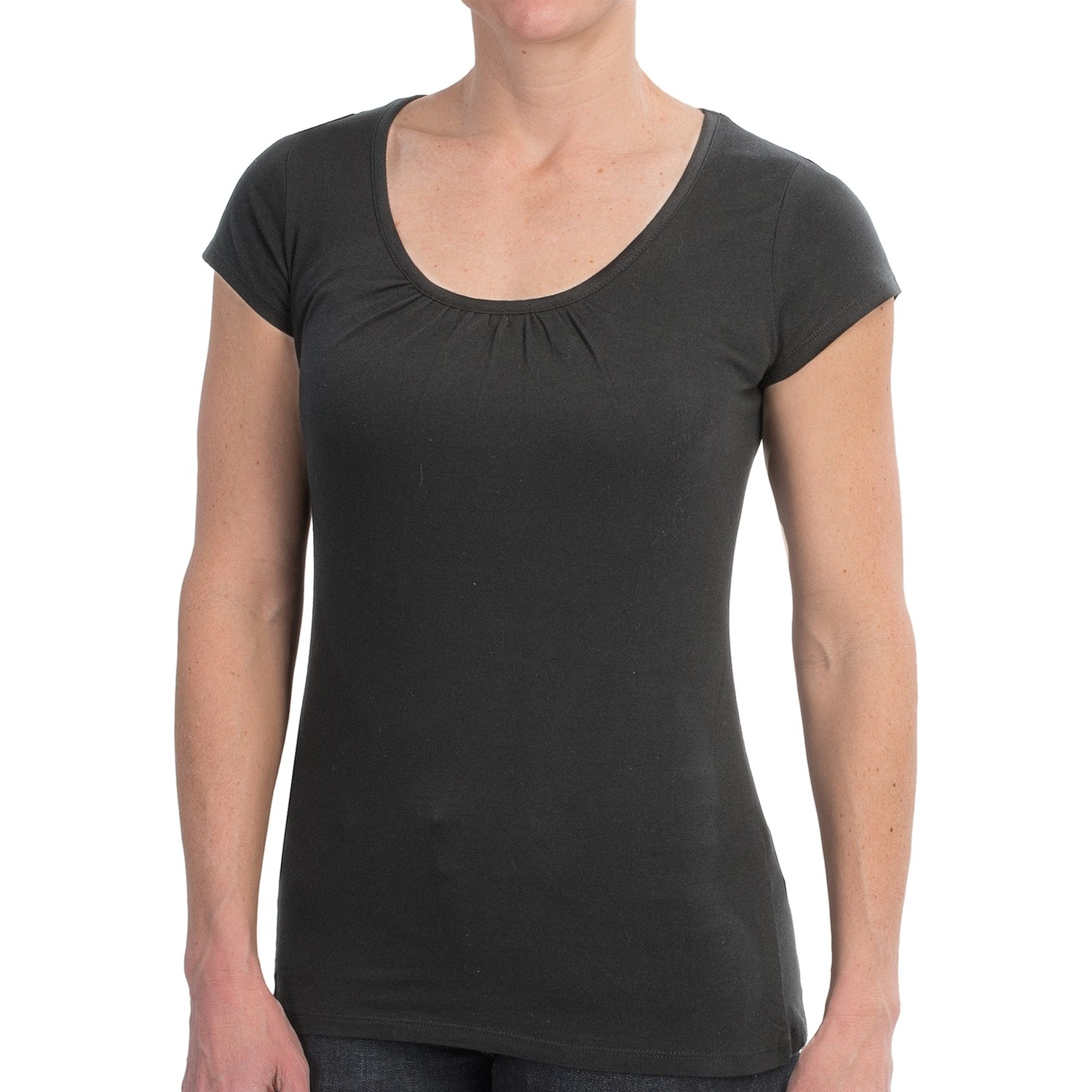 2nds. A shapely feminine fit and eye-catching gathered scoop neckline offers a gorgeously chic touch to this fitted shirt, a versatile, cap sleeve beauty that goes with almost anything.