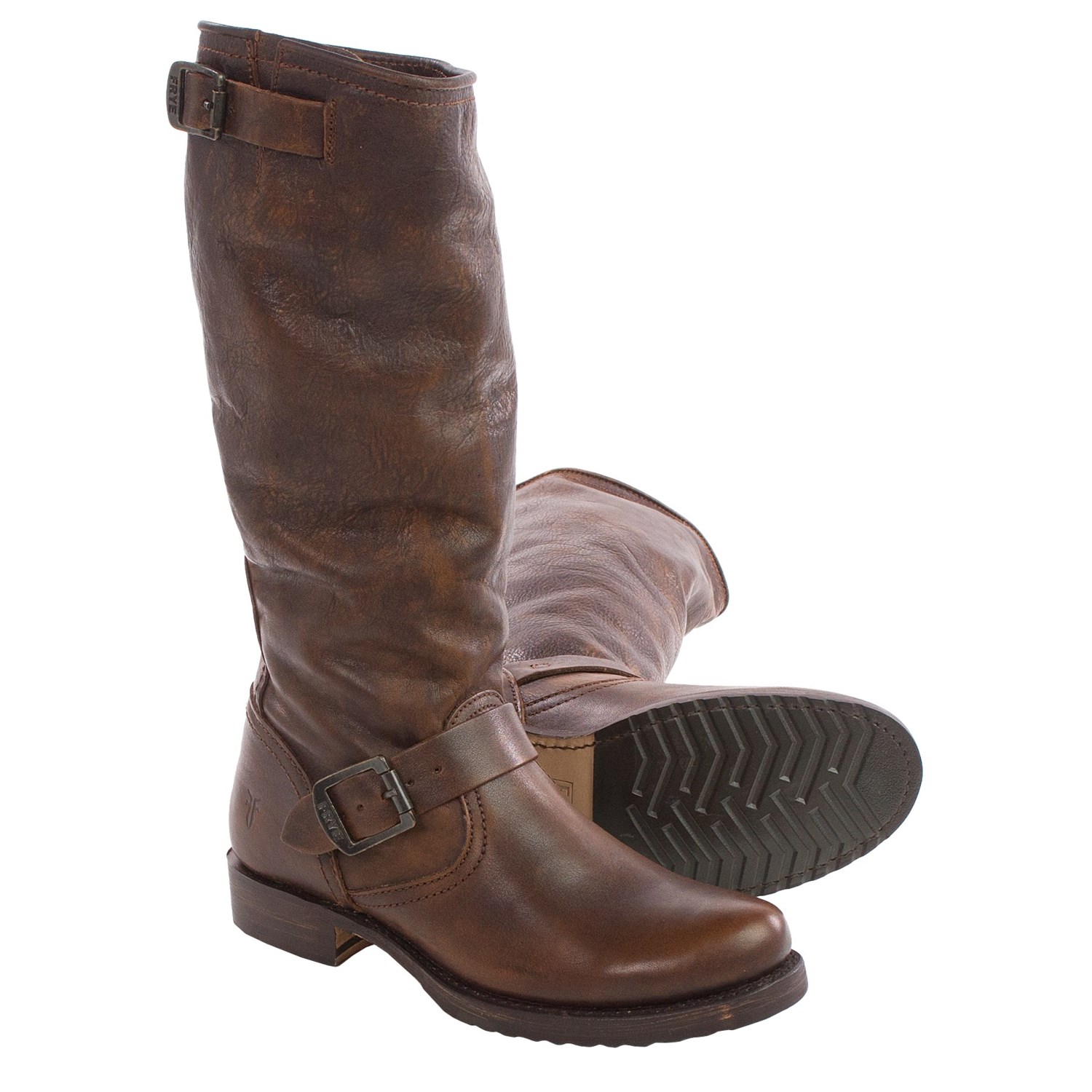 Closeouts. A rugged engineer-inspired boot with a touch of sass, the Frye Veronica slouch boot offers a rich, rustic appeal that’s sure to stand the test of time. The burnished pebbled leather upper is complemented by two eye-catching buckle strap accents, and the relaxed fit offers a loose, slouchy appeal.