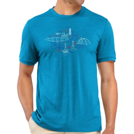 Discontinued. The sketched gear print on the front of Icebreaker’s Tech Lite All in a Day shirt offers a plethora of ideas for ways you can take advantage of the great outdoors in the shirt’s naturally high-performance merino wool construction.
