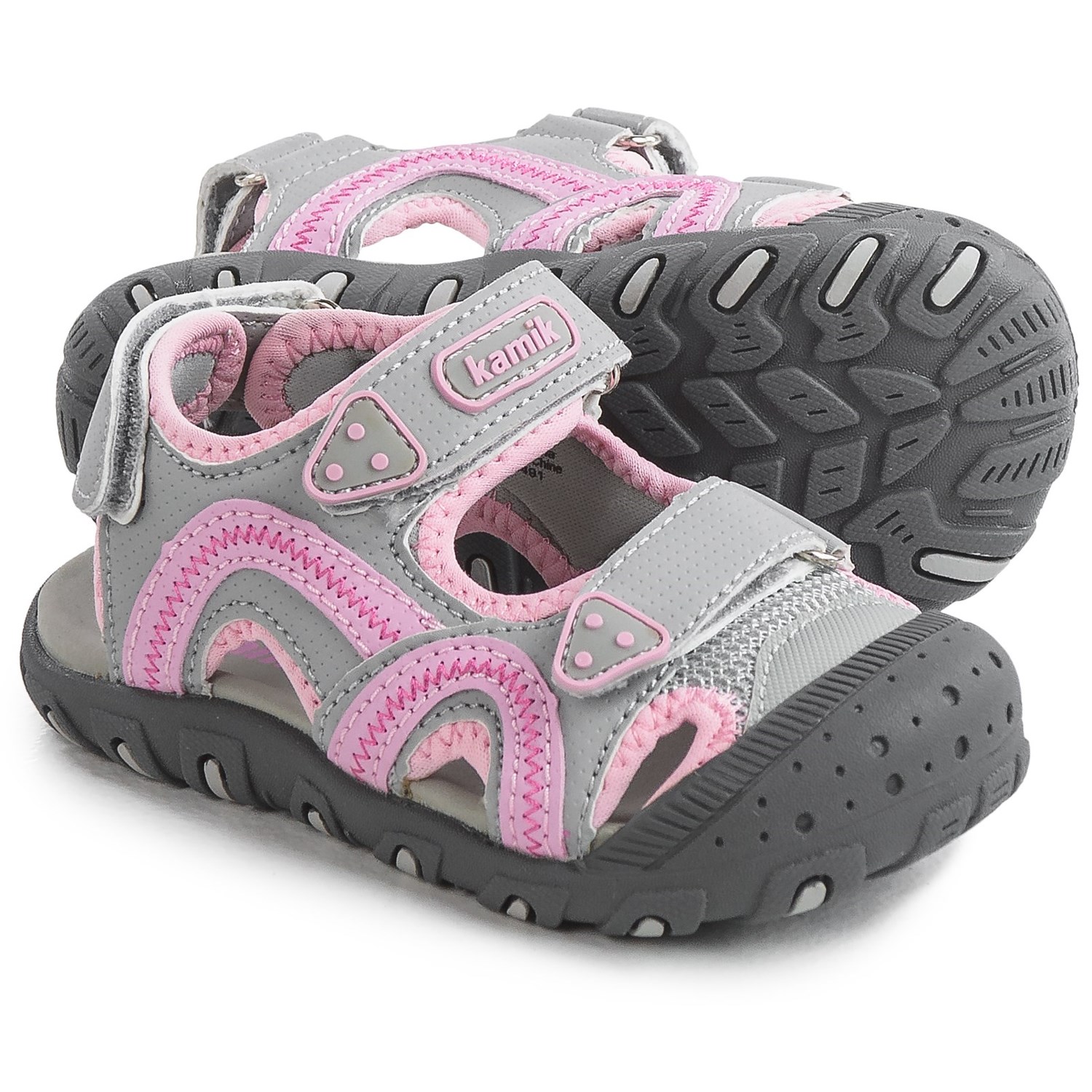 Closeouts. Triple touch-fasten straps on Kamik’s Sea Turtle sport sandals deliver a perfect adjustable fit, and the water-friendly, slip-resistant design makes them perfect for all your little explorer’s summertime adventures. A rubber cap offers extra protection for tiny toes, too.