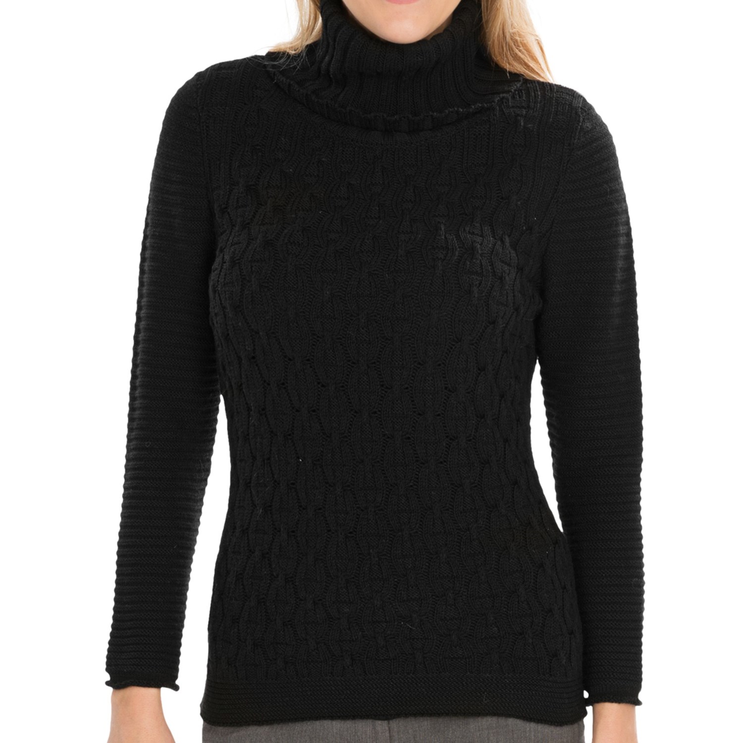 Closeouts. The superlative quality of the merino wool is immediately apparent when you get up close and personal with Lafayette 148 New York’s Cable Links turtleneck sweater — a beautiful mixed-knit affair with linked cables in the body, wide rib-knit sleeves, and a uniquely braided horizontal rib-knit at the hem.