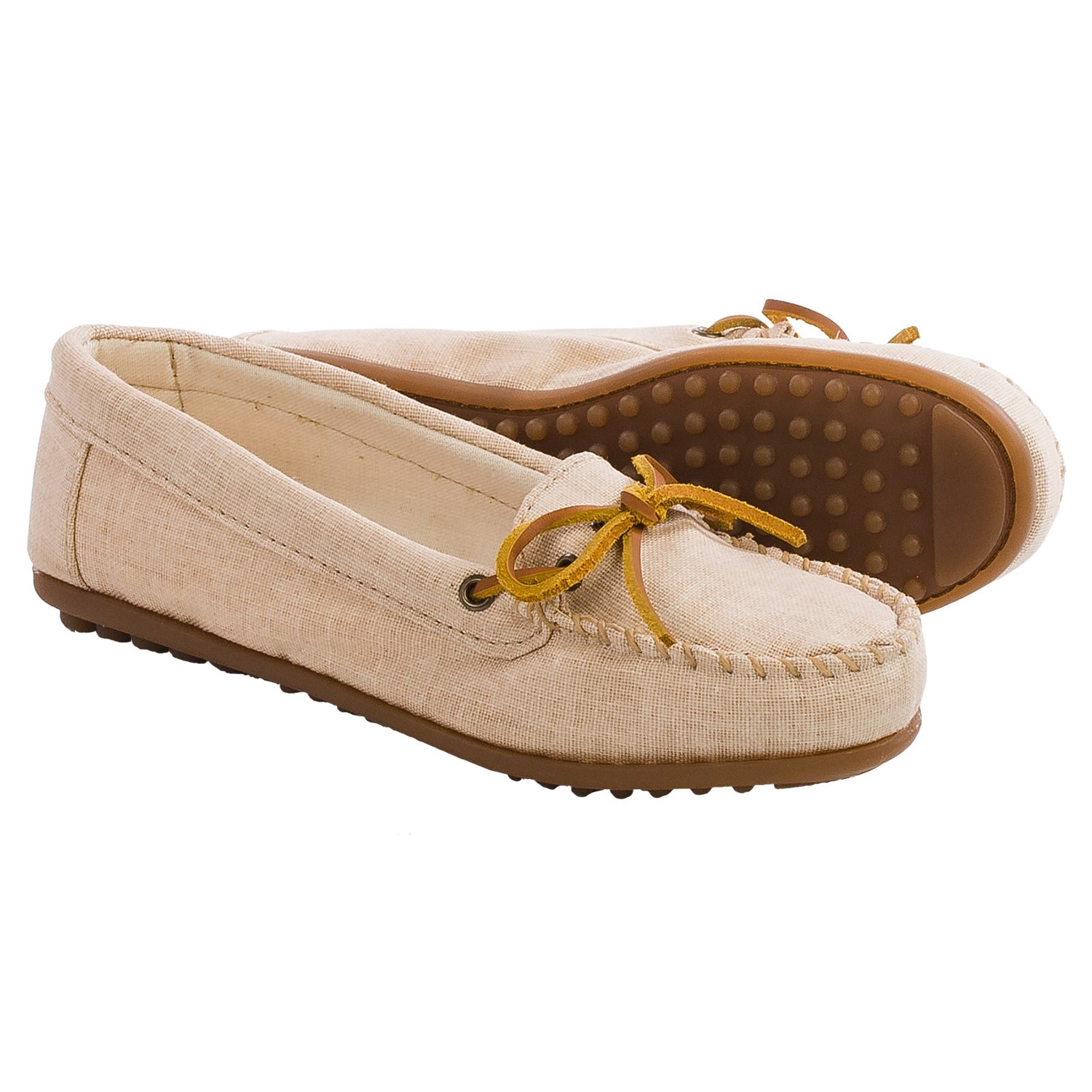 Closeouts. A classic moc silhouette with a stylish twist, Minnetonka’s canvas moccasins boast an eye-catching, lightweight canvas upper, handstitched moc toe and the traditional raw-leather instep bow.