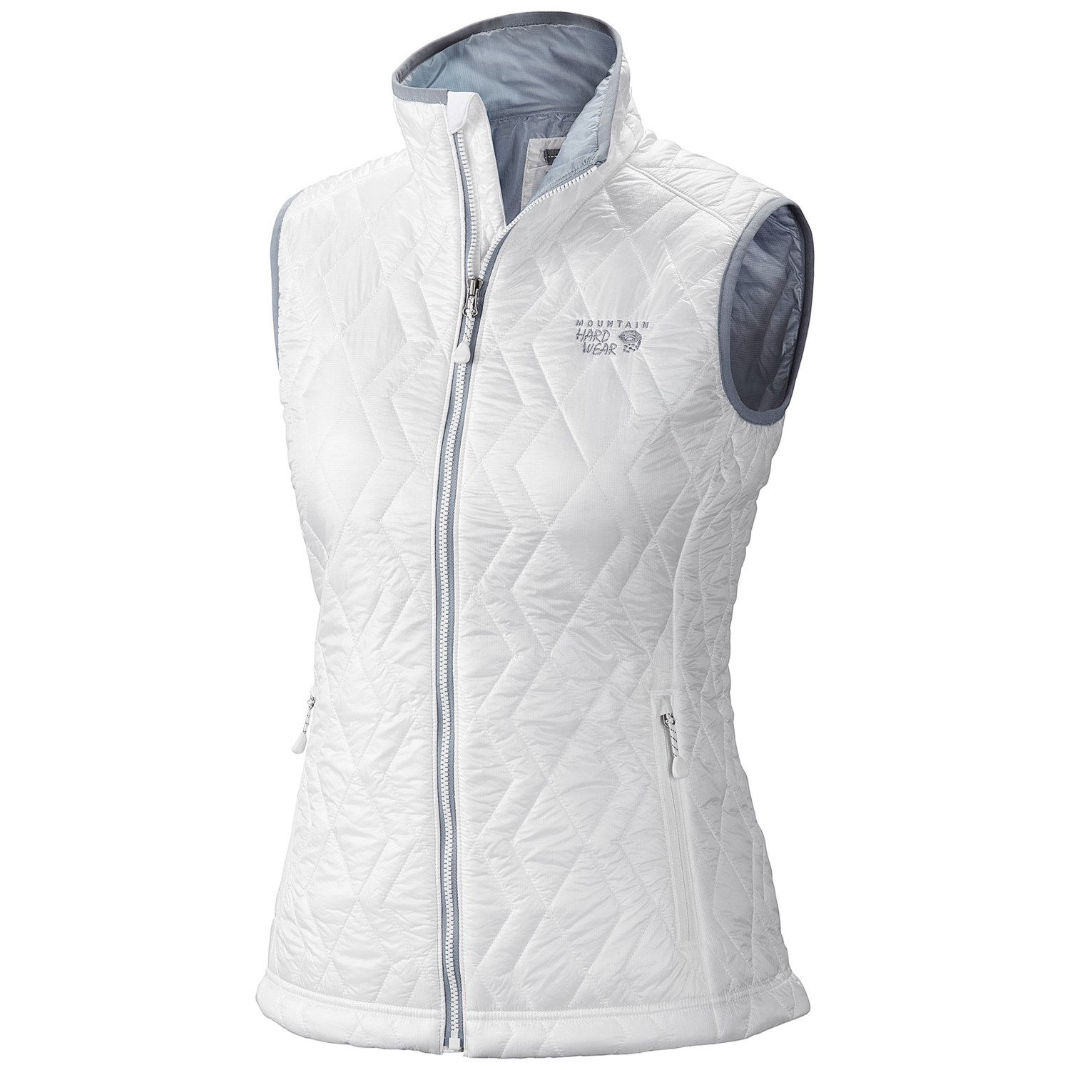 Closeouts. Incredibly lightweight and compressible, Mountain Hardwear’s Thermostatic vest has a water- and wind-resistant exterior for solo wear, and a low-profile fit for versatility as a midlayer.