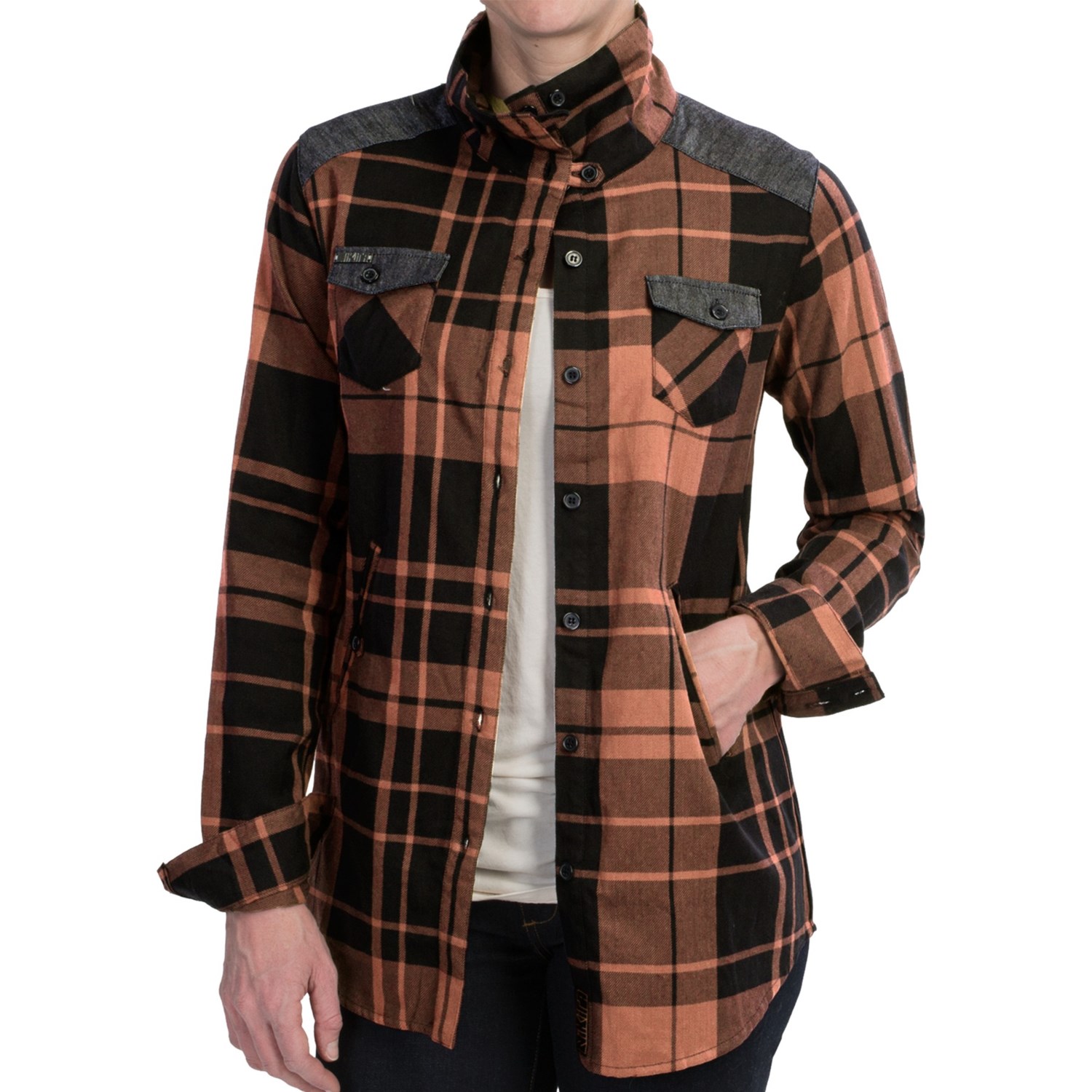 Closeouts. Kind of a female version of a woodsman plaid shirt-jac, Nikita’s Delano shirt has some weight to the cotton, so it’s great for weather heading into fall. Handsomely detailed with solid chambray accents and button-tab closures at the neckline and side pockets.