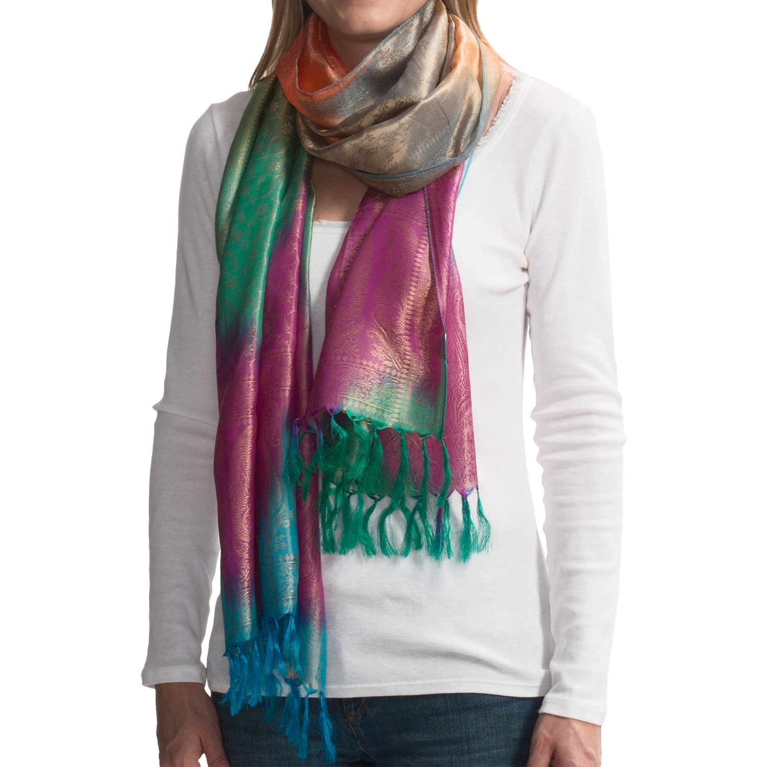Closeouts. Imbedded in the brightly colored hues of this Orvis silk jacquard scarf is a subtle pattern that only enhances the natural shimmer of silk. Large enough to wear as a stole, delicate enough to wrap as a scarf. With handsomely knotted fringe.