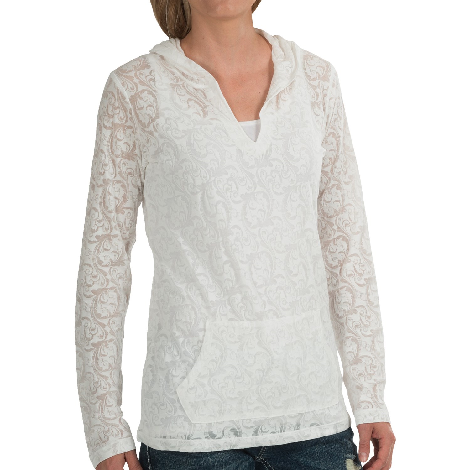 Closeouts. A burnout scroll pattern swirls around the lightweight cotton-poly fabric of Outback Trading’s Lyia hoodie, and an attached hood and kangaroo pocket add laid-back style.