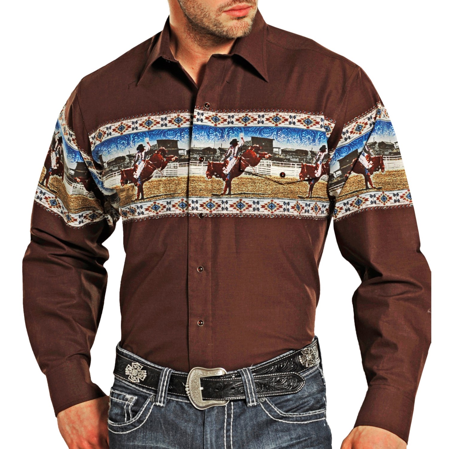 Closeouts. Featuring a vintage-inspired design of a bucking bronco and cowboy in a rodeo arena, Panhandle Slim’s Scenic Border Print shirt offers a beautiful look into a classic American tradition, all atop a light, soft-woven cotton with pearlized snaps.