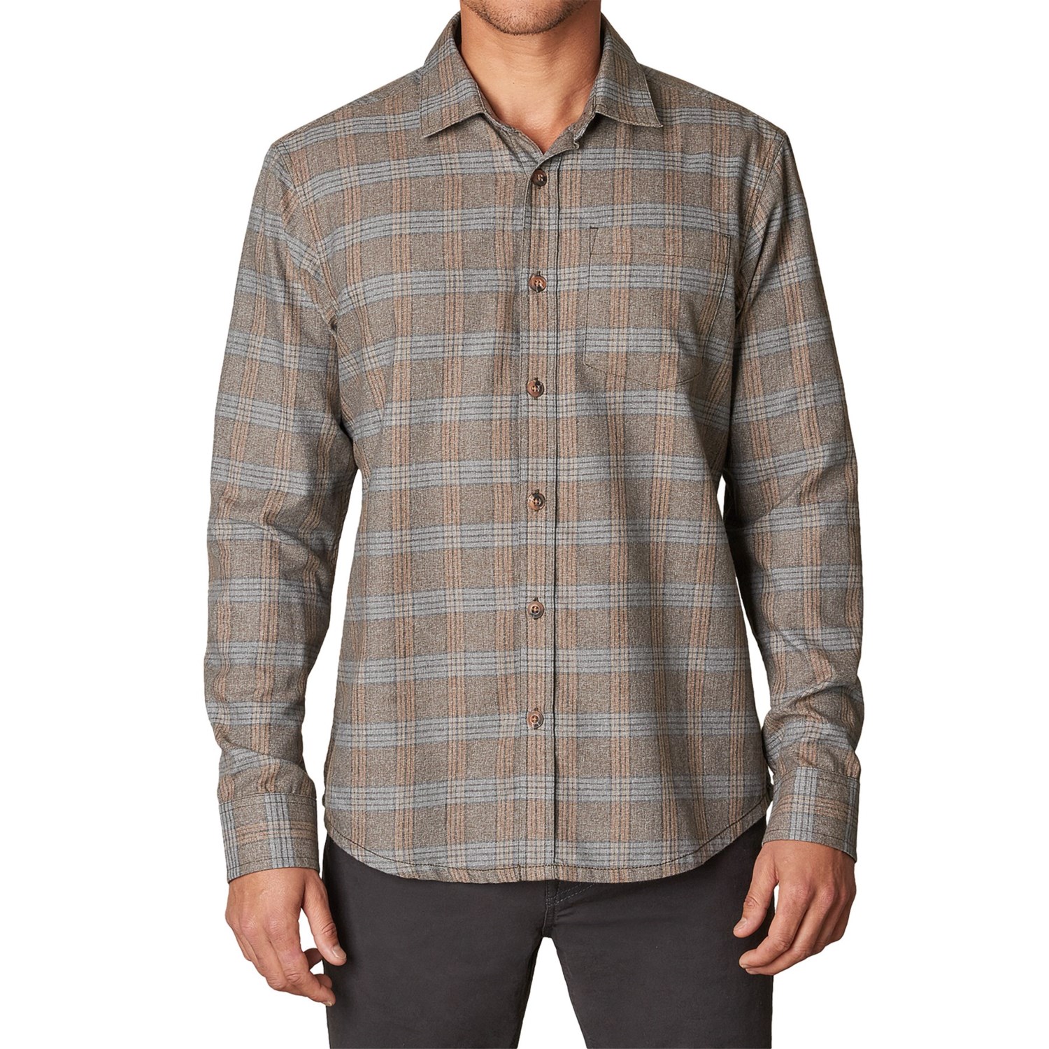 Closeouts. Muted, earthy hues add understated style to prAna’s Alabaster flannel shirt, handsomely tailored and crafted from a durable organic cotton blend for long-lasting wear.