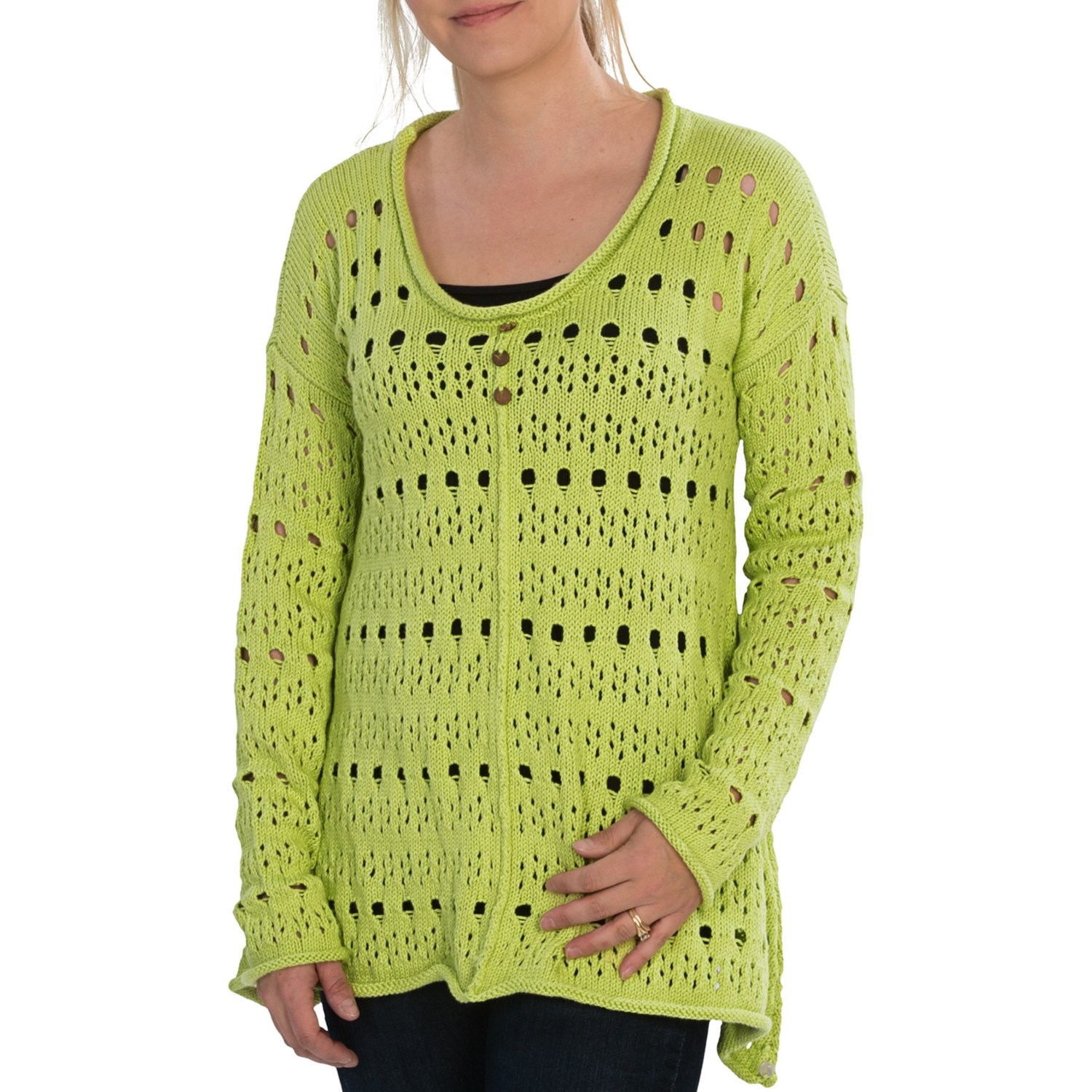 Closeouts. Great over a camisole or swim top after the sun goes down, this Pure Handknit Pebbled pullover is swingy and fun, with playful peek-a-boo drop stitching and an asymmetric hem.