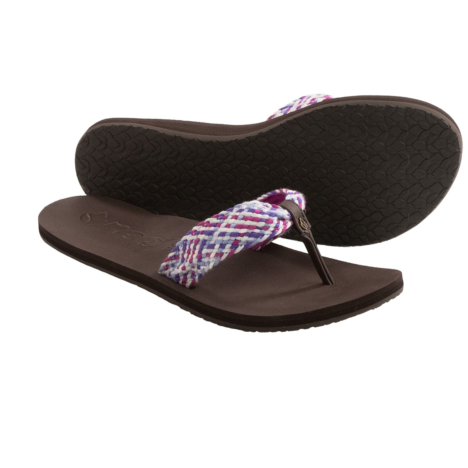 Closeouts. The woven straps of Reef Mallory Scrunch flip-flops offer a rustic look, and the soft lining means you’ll never want to take them off.
