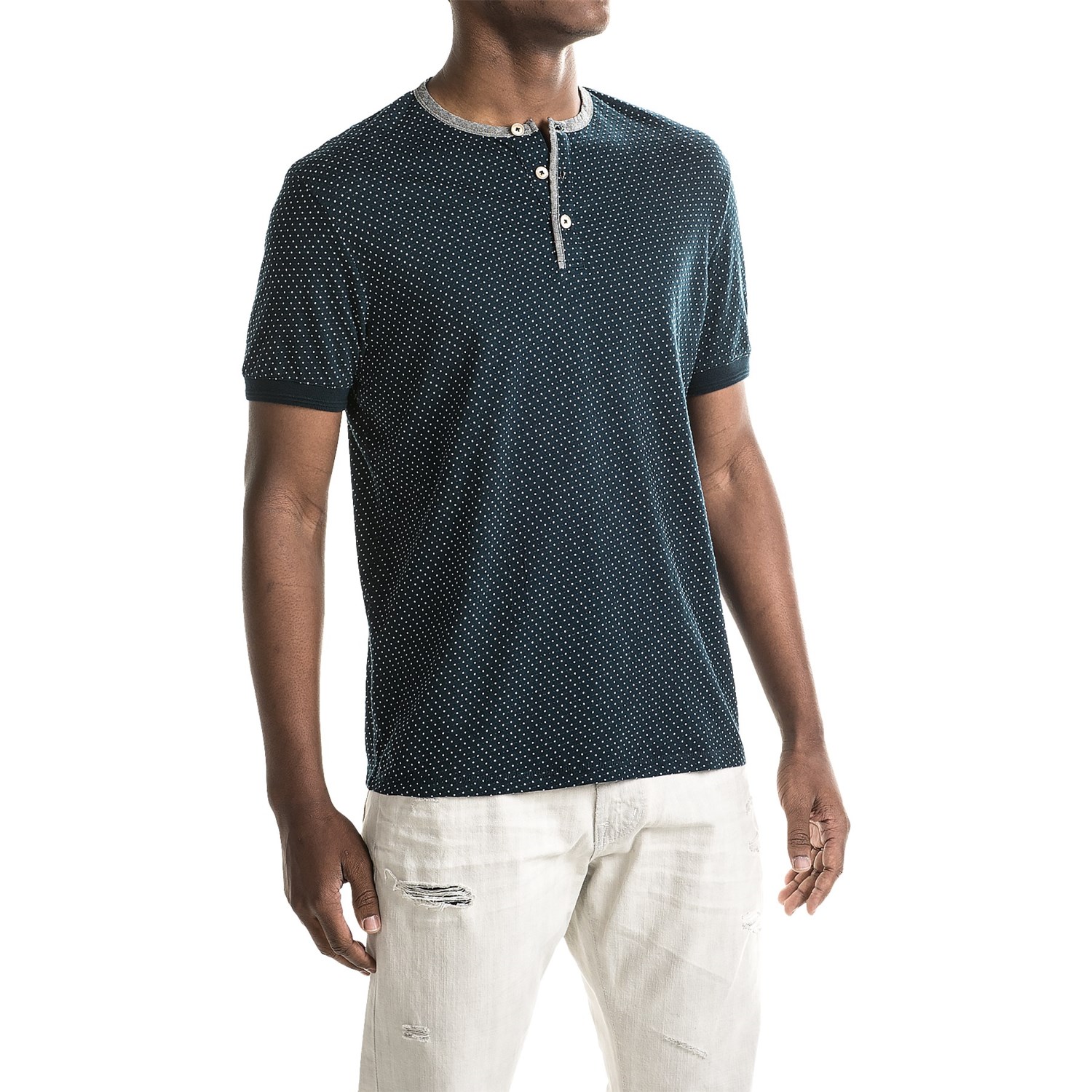 Closeouts. With just as much soft-and-light comfort as an ordinary T-shirt and an extra dose of casual style, this Report Collection’s Dot henley shirt is just right for easygoing weekend get-togethers.