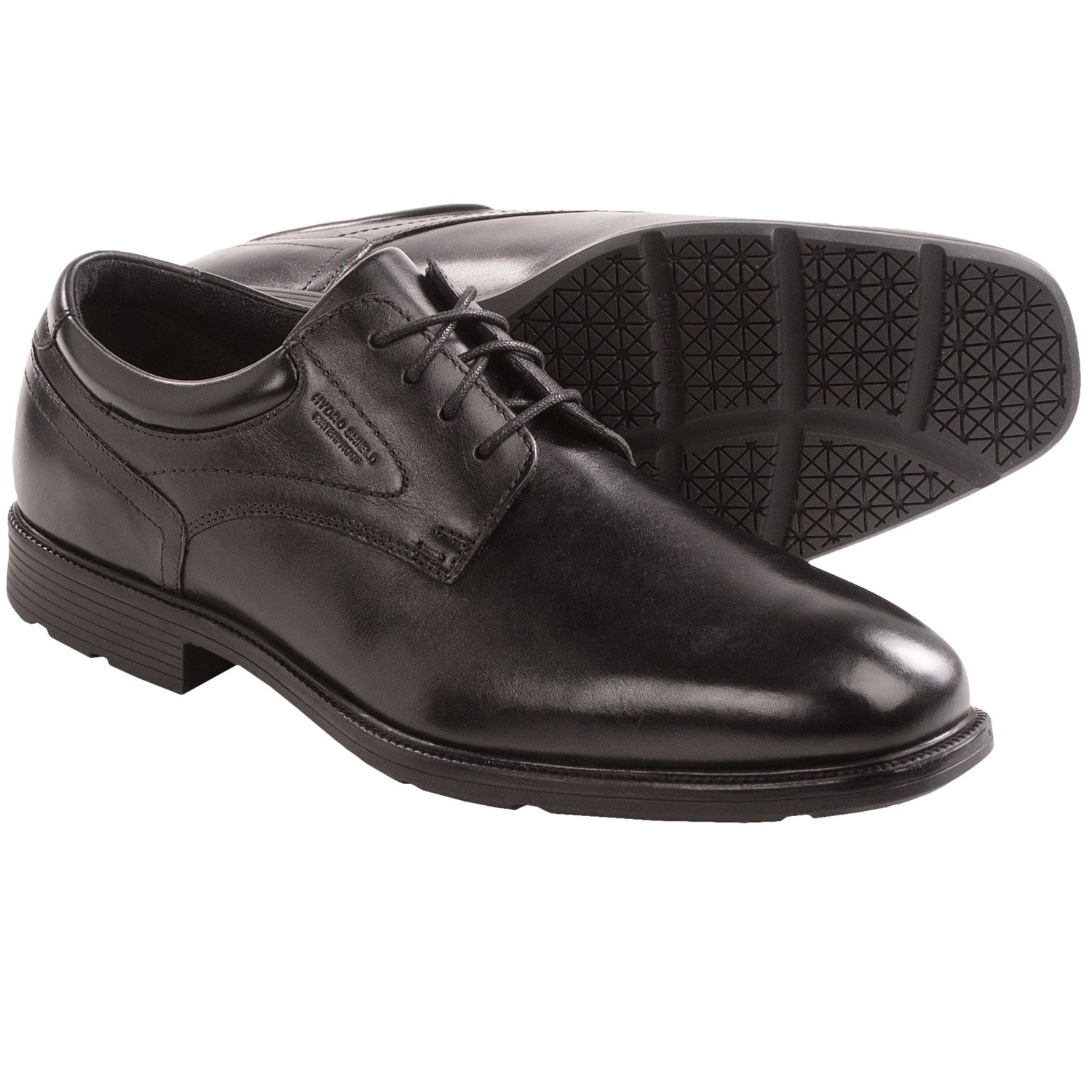 Closeouts. Rockport’s plain toe shoe pairs classic good looks with waterproof performance so the elements won’t rain on your style parade. Polished leather with Hydro-Shield® technology keeps your feet dry, adiPRENE® by Adidas heel cushioning delivers a comfortable step, and the non-slip outsole provides traction in challenging conditions.