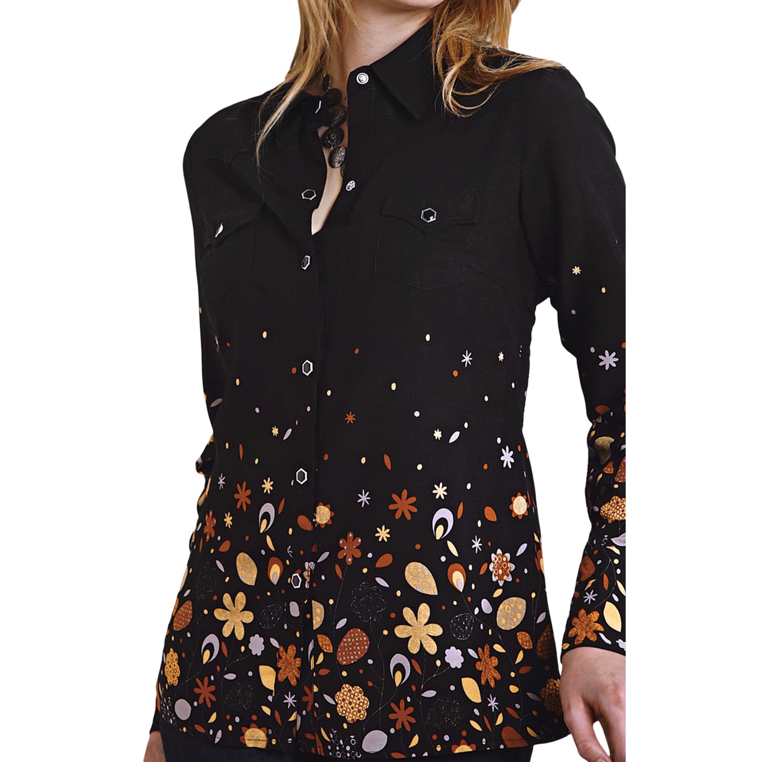 Closeouts. For cowgirls who want to dress it up for a day, Roper’s Border Print shirt incorporates a fun floral print into its classic western style.