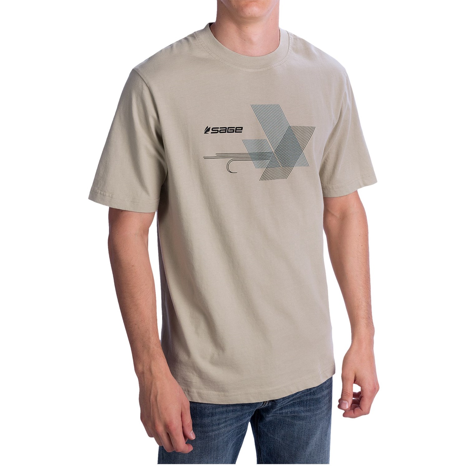 Closeouts. High-flying style and laid-back comfort are what the Sage graphic fly T-shirt is all about. The durable cotton features a relaxed crew neck and short sleeves, and the eye-catching front graphic keeps your mind on the water even when you’re on dry land.
