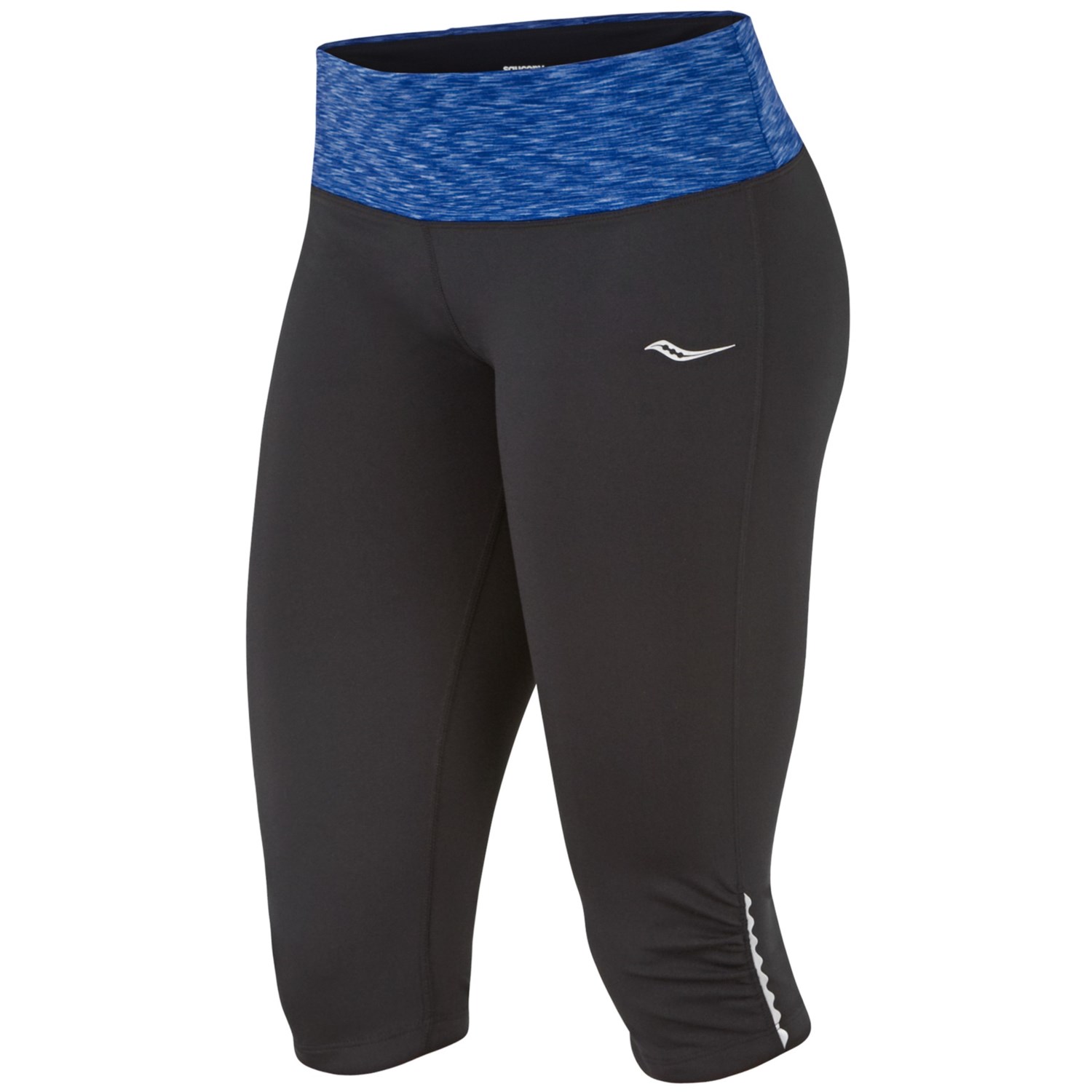 Closeouts. A contrast-color space-dye waistband and ruched knees with scalloped reflective trim add sporty style to the active performance of Saucony Ruched LX capris, made of moisture-wicking, chafe-resistant and supportive stretch fabric that’s perfect for running.
