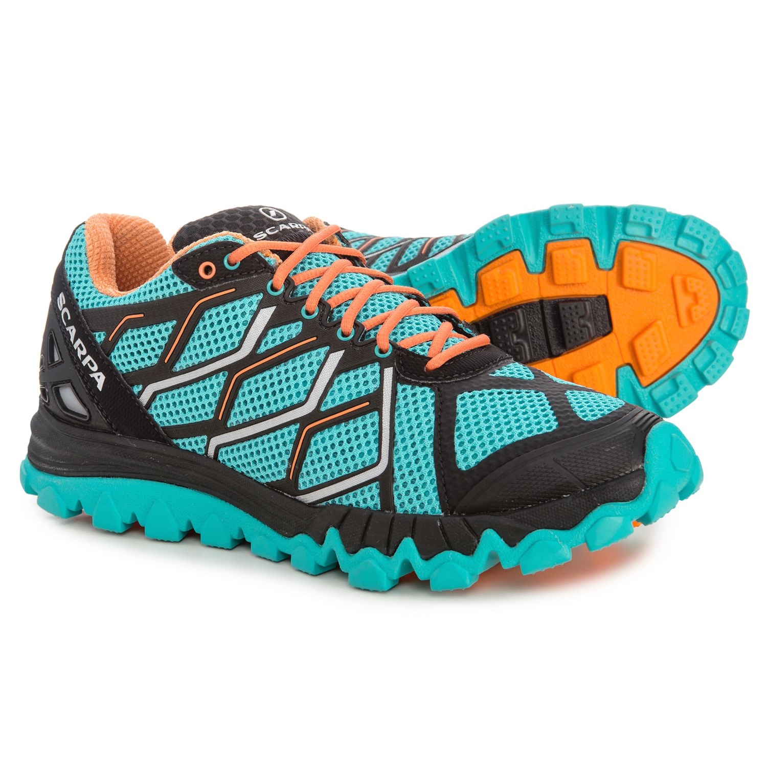 Closeouts. For maximum protection with lighter weight, Scarpa’s Proton trail running shoes fit the bill thanks to a traction-heavy Vibram® outsole with minimal lugs for maximum grip, and a cushioned-yet-lightweight EVA midsole.