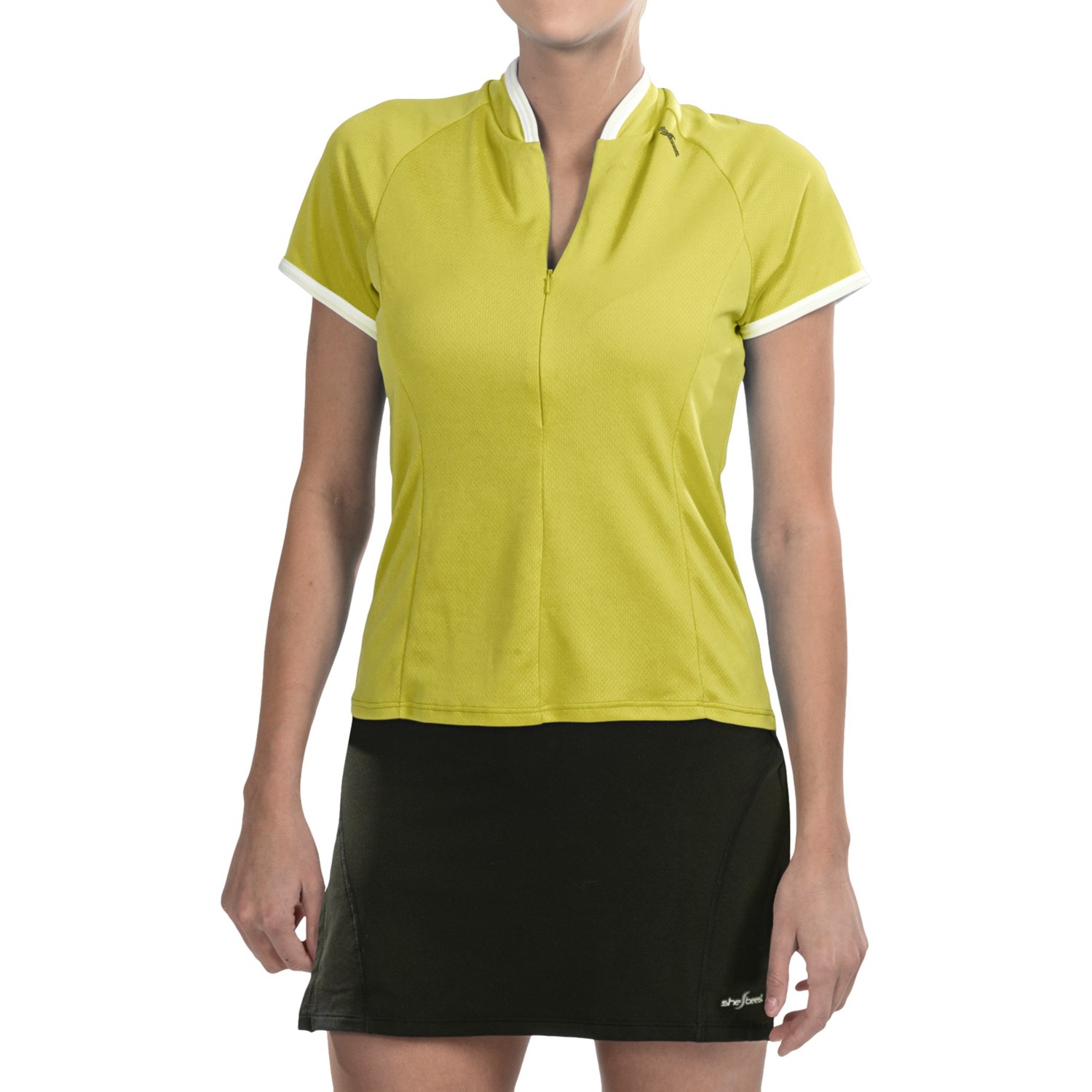 Closeouts. Designed by women cyclists for women cyclists, this Shebeest Bellissima cycling jersey offers cool, dry comfort and protection from harsh UV rays.
