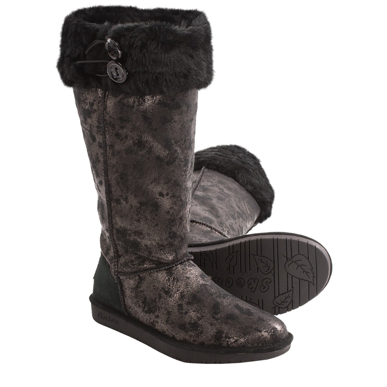 Closeouts. Go for luxe in Skechers’ Shelbys Rain or Shine boots, eye-catching with their distressed, metallic-print microfiber upper and trimmed in plush, touchable faux fur.