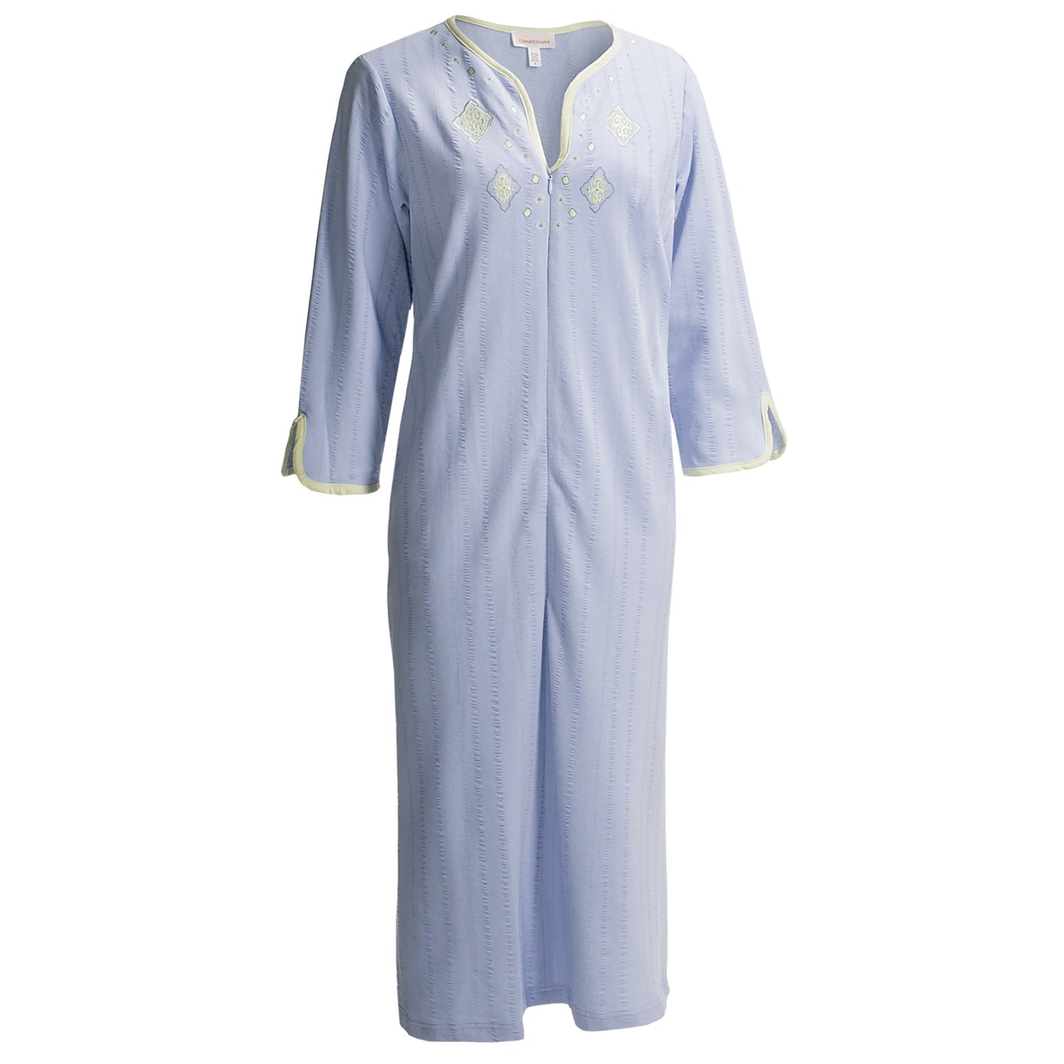 Closeouts. Nothing beats a caftan for easy-wearing comfort Saturday mornings, and Stan Herman’s French Terry caftan has a uniquely textured stripe reminiscent of seersucker, and pretty satin-stitch decals adorning the neckline.