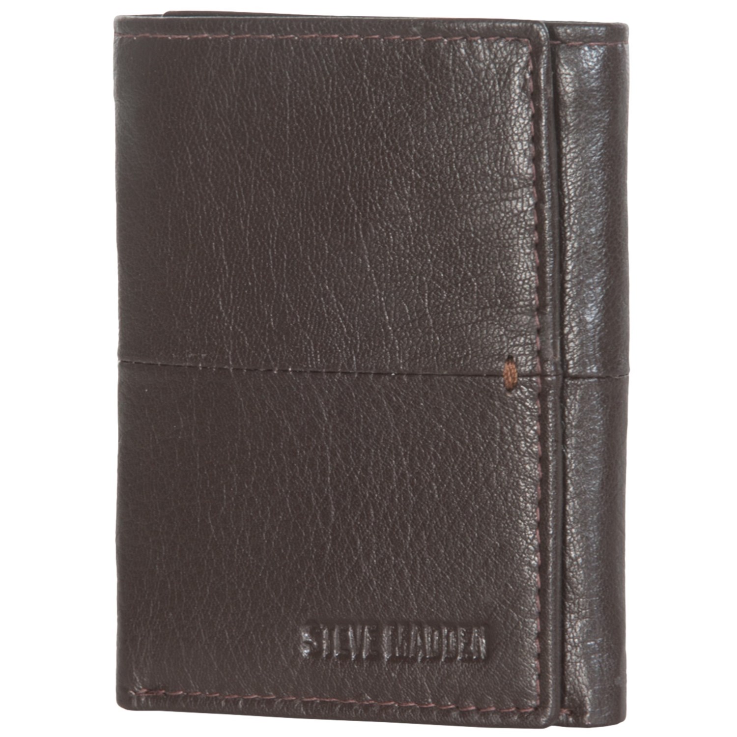 Closeouts. Decorative bar tacks and a dissecting stitch line add a note of style to Steven Madden’s Buck Bar trifold wallet. Fashioned from premium, supple leather it has a handy thumb-glide window for easy removal of your ID.