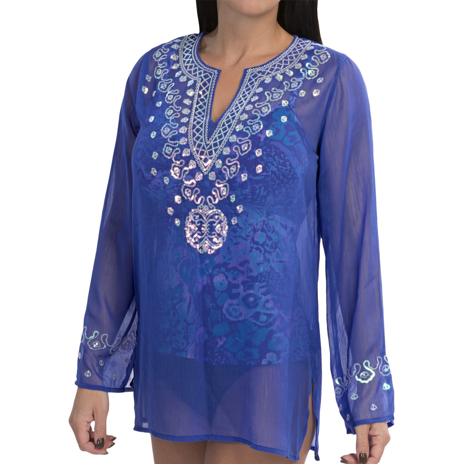 Chiffon Sequin Beaded Neckline Cover-Up – Long Sleeve (For Women)