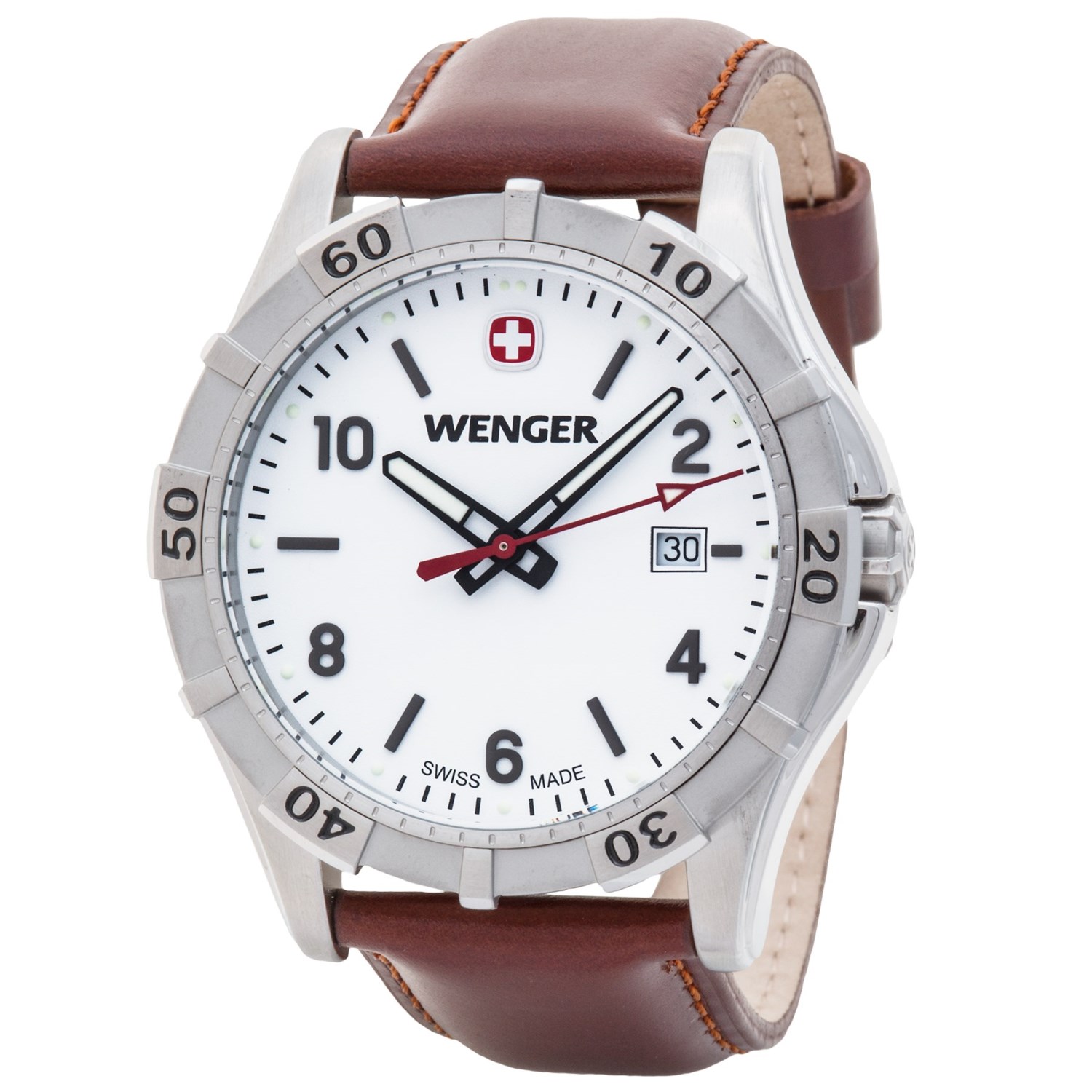 Closeouts. Embodying classic Swiss styling with a refined leather strap, this Wenger Platoon watch is ready to deploy in the field or your urban cubicle. Durable, dependable and impressive, with excellent timekeeping technology and water resistance to 100m.
