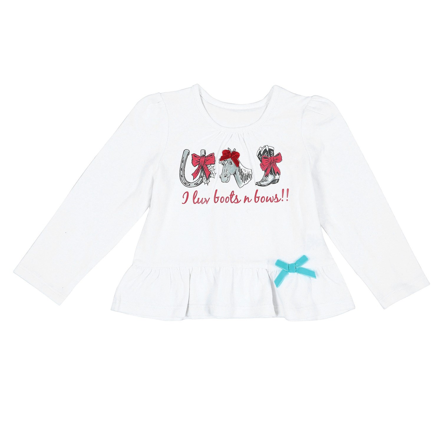 Closeouts. Your little rodeo queen will love the horse drawings and girly bows on this Wrangler Screenprint T-shirt. Simply styled with a little ruching at the neckline and a sweet ruffled hem