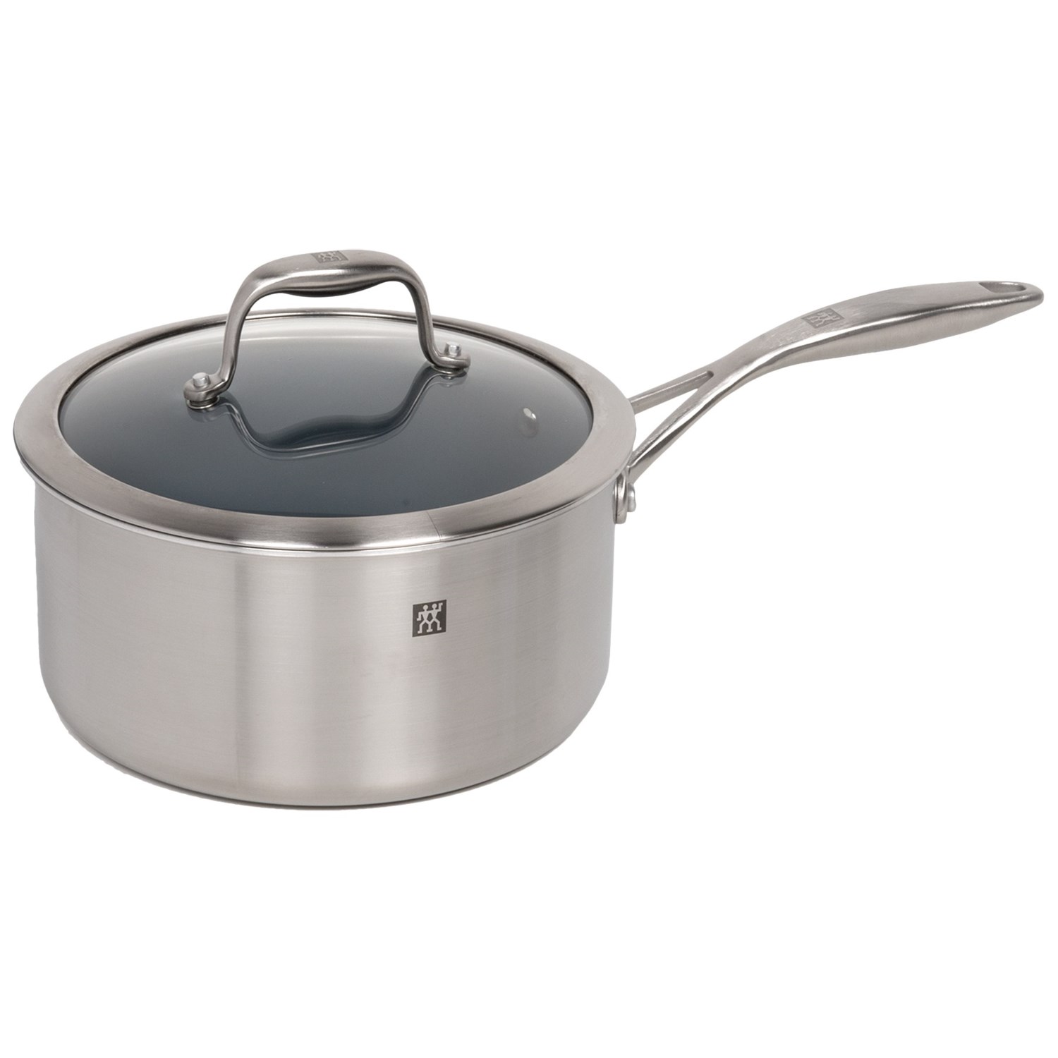 Closeouts. The fully clad Zwilling J.A. Henckels Sol Thermolon® saucepan is a masterpiece of stainless steel, ceramic nonstick coatings and an even-heating aluminum core. The glass lid lets you monitor cooking without letting steam escape, and the flared rim allows non-drip pouring. Stay-cool handle, too!